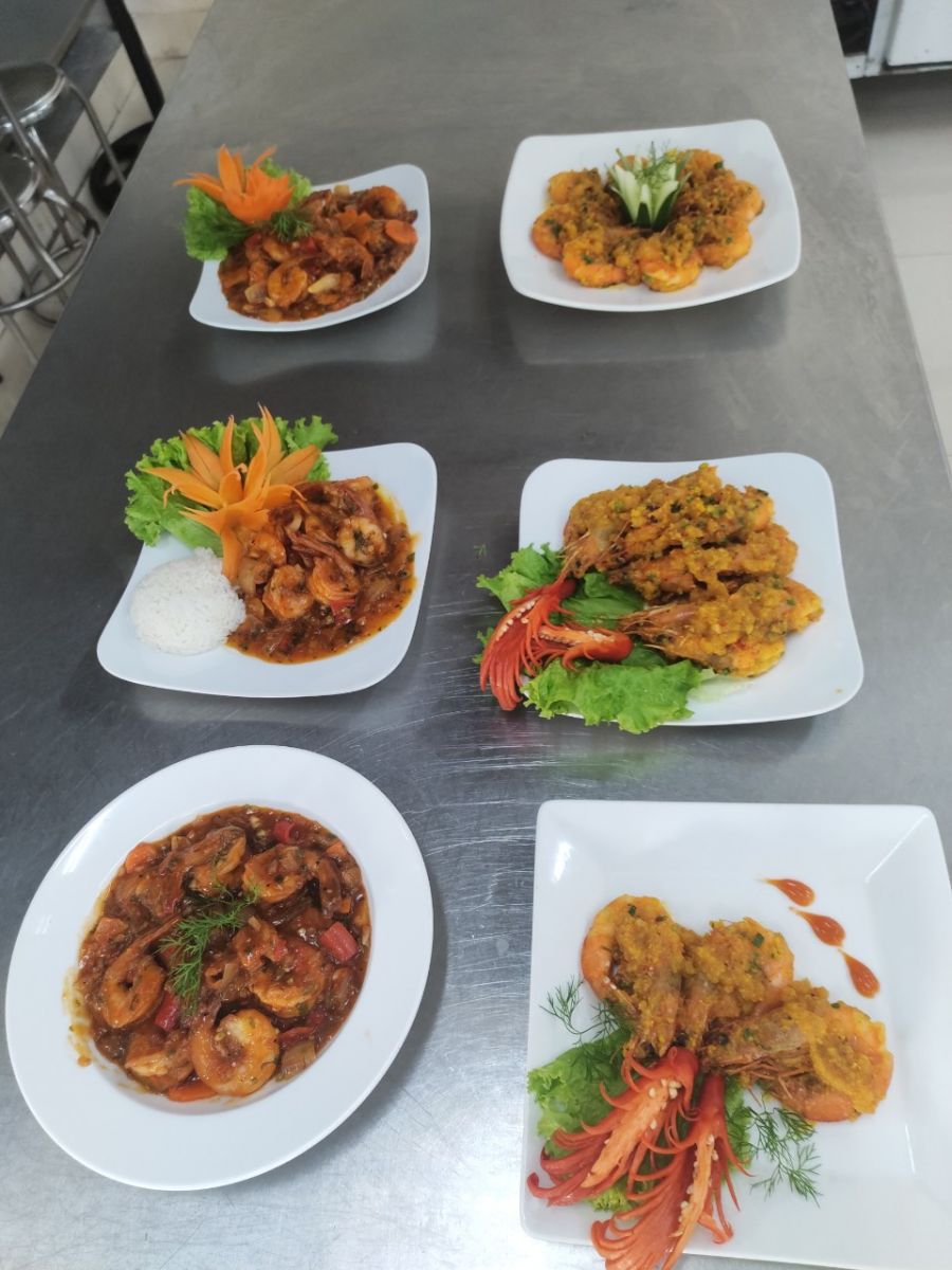 Chế biến món ăn từ hải sản: tôm, cá, mực: ngoài các món thông thường còn có một số món có trong thực đơn của các nhà hàng cao cấp như tômm chiên trứng mặn/ Ebimayo, tôm xốt chua cay